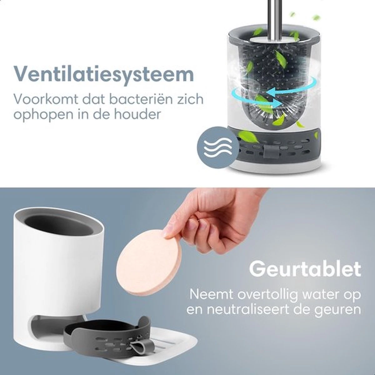 De hygiënische 2BEHOME luxe toiletborstel met houder is een aanwinst voor elk toilet. De innovatieve borstel maakt het reinigen super gemakkelijk en zorgt voor een ultiem gebruiksgemak en optimale hygiëne. Het stijlvolle design past in elk interieur en de houder kan op de grond geplaatst worden of eenvoudig worden opgehangen met een sterke plakstrip. Daarnaast is de houder voorzien van een ventilatie systeem & vochtabsorberende pad voor optimale hygiëne. Dankzij het ergonomische design maak jij het toilet in een handomdraai weer schoon en fris.