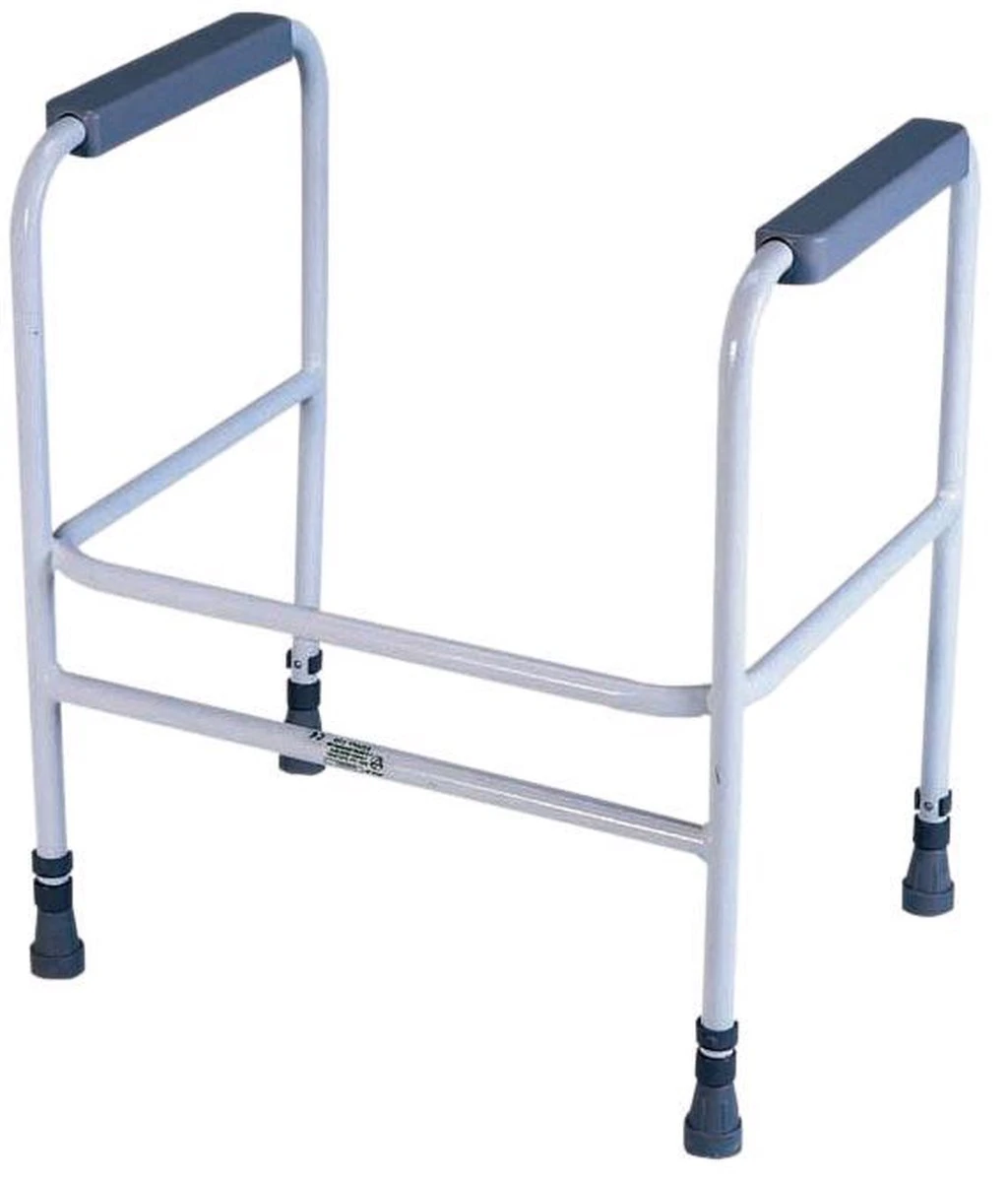 In hoogte verstelbaar toilet frame. Speciaal gemaakt voor mensen die moeite hebben met gaan zitten op, en opstaan van een standaard toilet. De VR205 is volledig aan te passen aan de behoeftes van de gebruiker, omdat hij in hoogte verstelbaar is. Het is een frame dat om het toilet geplaatst wordt met aan beide zijden een armleuning zodat je steun hebt bij het gaan zitten en opstaan.