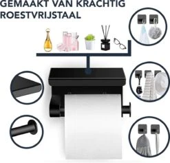 Toiletrolhouder Met Plankje – Zelfklevend Of Boren – WC Rolhouder – Incl. Handdoekhaakjes – Zwart
