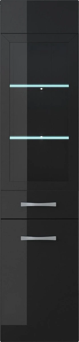 De deuren van de kast kunnen zowel links als rechtsdraaiend gemonteerd worden. De kast is uitgevoerd in zwart met hoogglans frontjes.