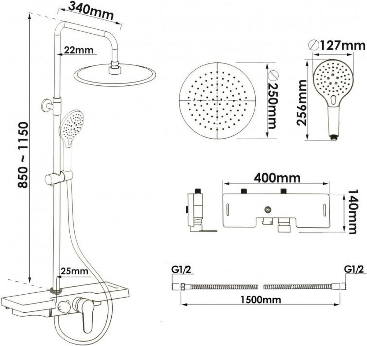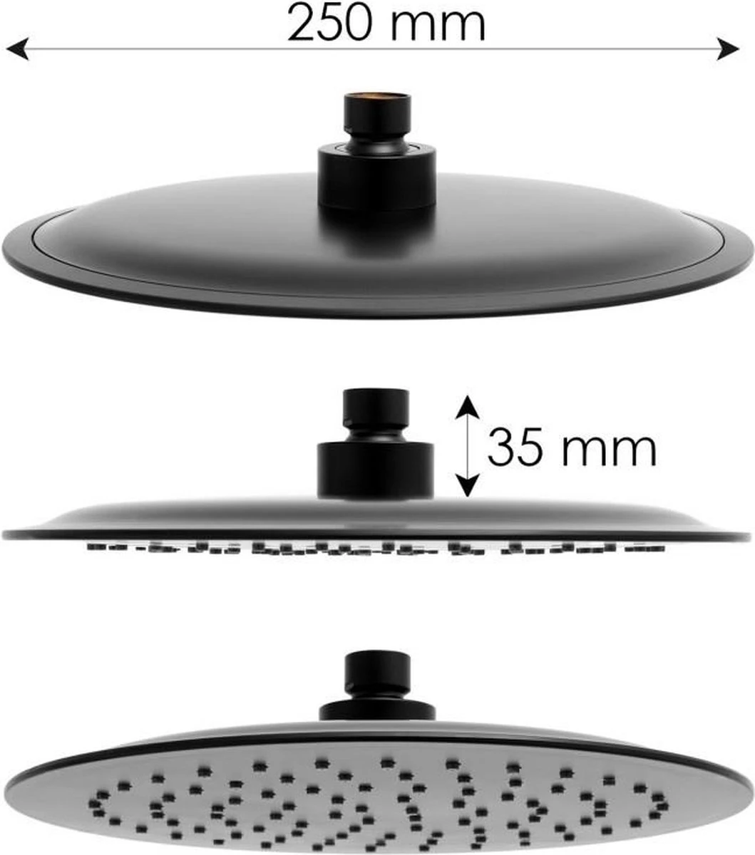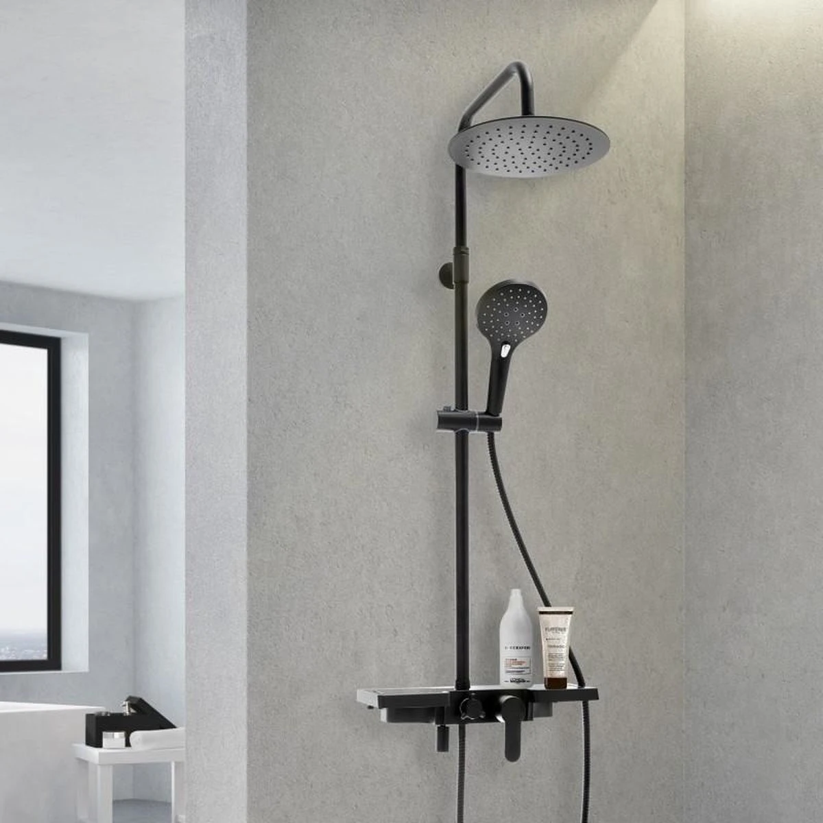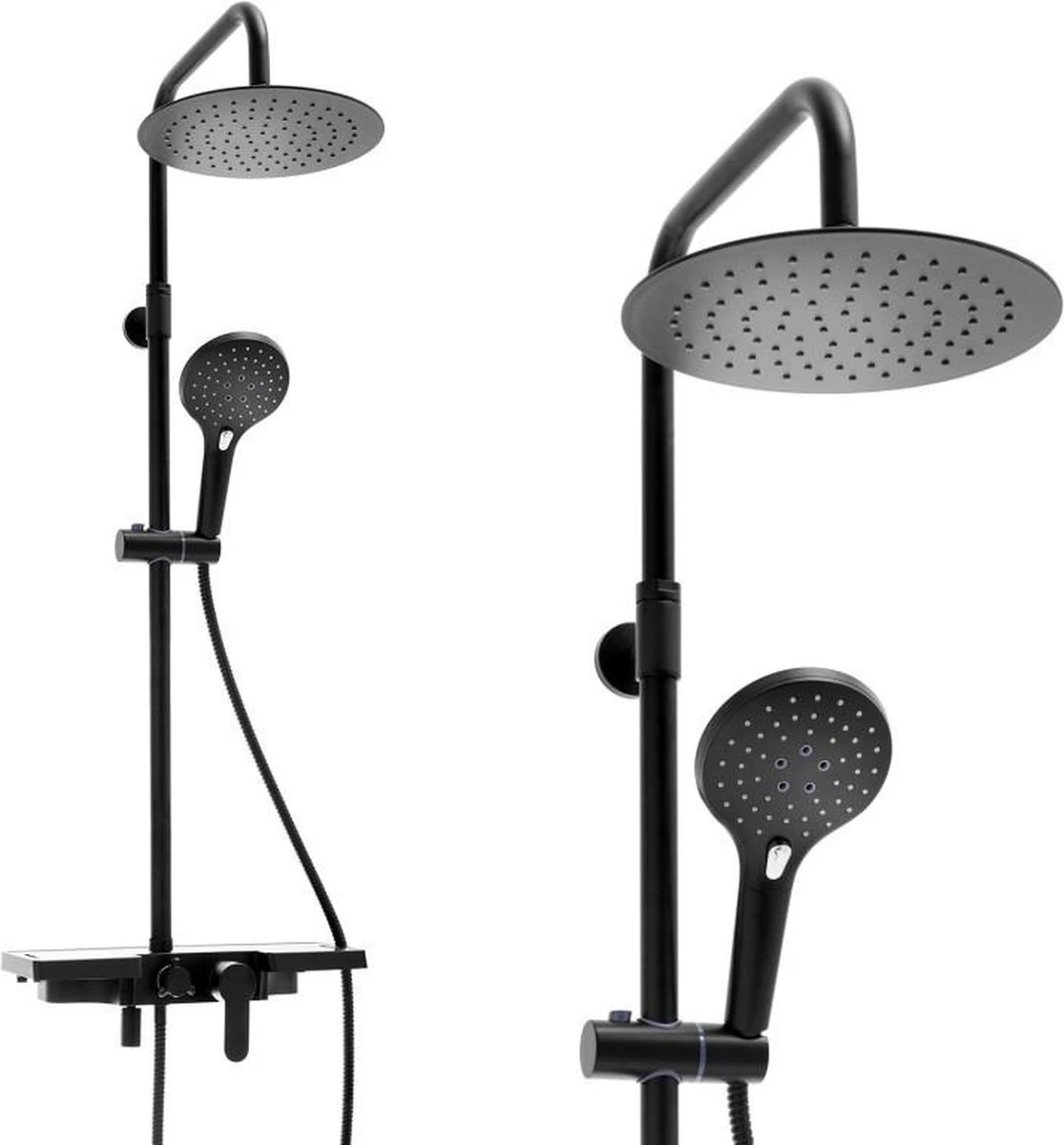 De set bevat een douchemengkraan met temperatuurmengkraan, watervolume aanpassing en een waterstroomschakelaar tussen de regendouche en de handdouche. Daarnaast is de doucheset voorzien van een brede plank voor handige accessoires, waaraan een kraan en uitloop zijn bevestigd. Het plank oppervlak is mat zwart van kleur. De keramische kop van de kraan (35 mm) garandeert duurzaamheid en sterkte. De doucheset bevat een stijlvolle regendouche met een diameter van 25 cm en een en een handdouche die is uitgerust met twee waterstraalstanden welke met een knop op het handvat kunnen worden veranderd – beide met een modern ANTI-CALC-systeem.