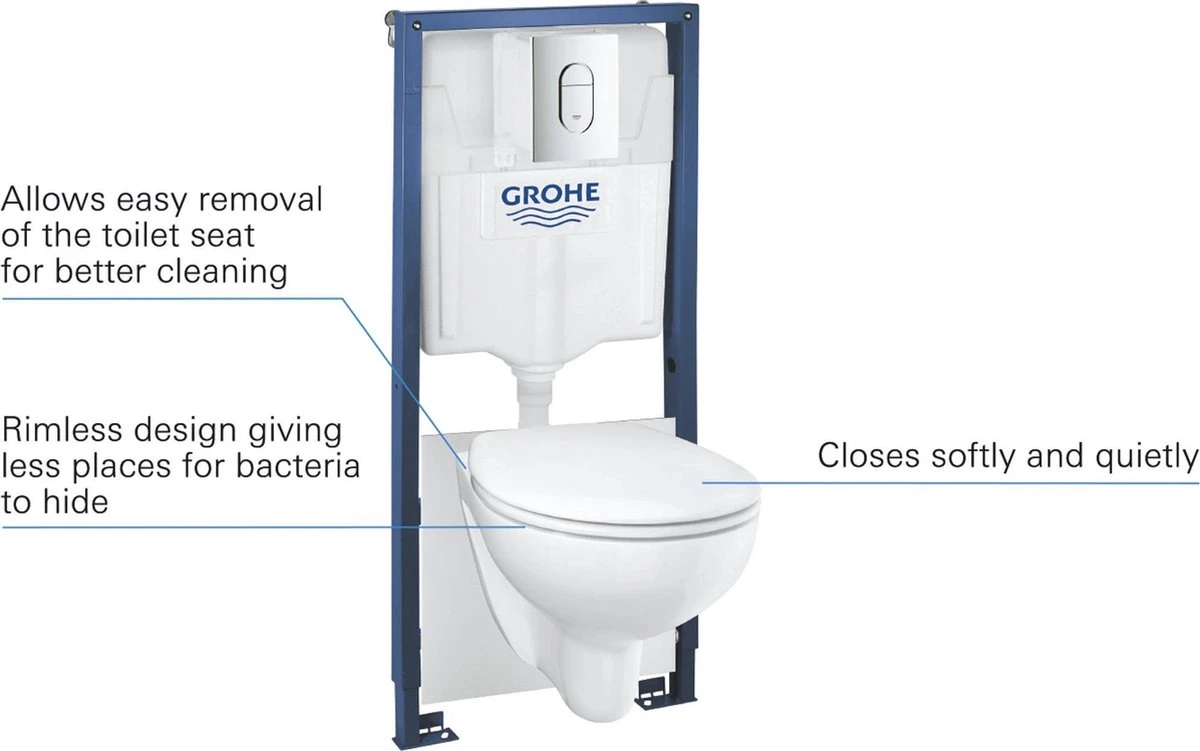 Met een hangende wc en verborgen waterreservoir zal het een stuk eenvoudiger zijn om je badkamer te reinigen. Bovendien heeft de wandcloset geen spoelrand. Zo blijven er geen bacteriën achter. Extra hygiënisch dus! De zitting is voorzien van softclose waardoor hij altijd langzaam en geruisloos sluit. Ook kun je de zitting in enkele simpele stappen verwijderen. Grohe Whisper geluiddemping vermindert het geluid van het spoelen en voorkomt dat het wordt overgedragen naar aangrenzende kamers. Dankzij EcoJoy dual-flush bespaar je bij het doorspoelen tot wel 50% op je waterverbruik.
