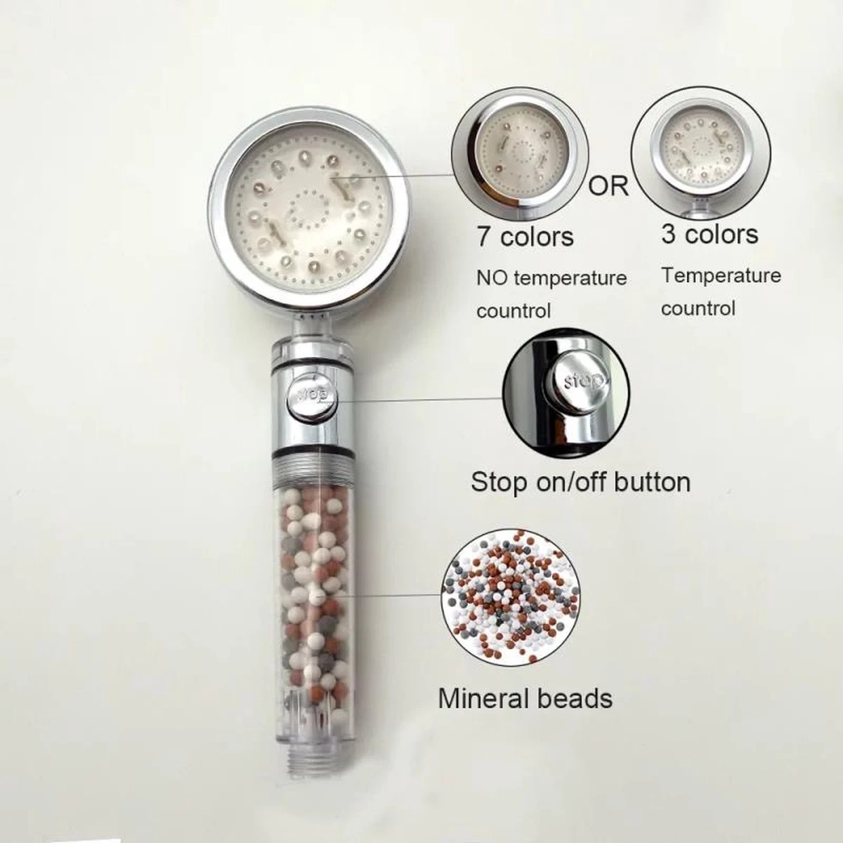 Deze douchekop bevat 3 kleuren die veranderen met de temperatuur van het water. Groen onder de 30 graden, blauw vanaf 31 tot 39 graden en rood vanaf 40 graden. De LED functie werkt op waterdruk, waardoor er geen batterijen nodig zijn. De douchekop bevat een stopknop om de waterstraal aan en uit te zetten.