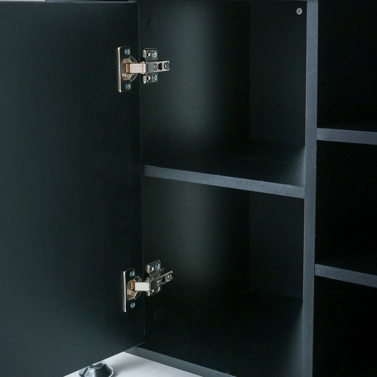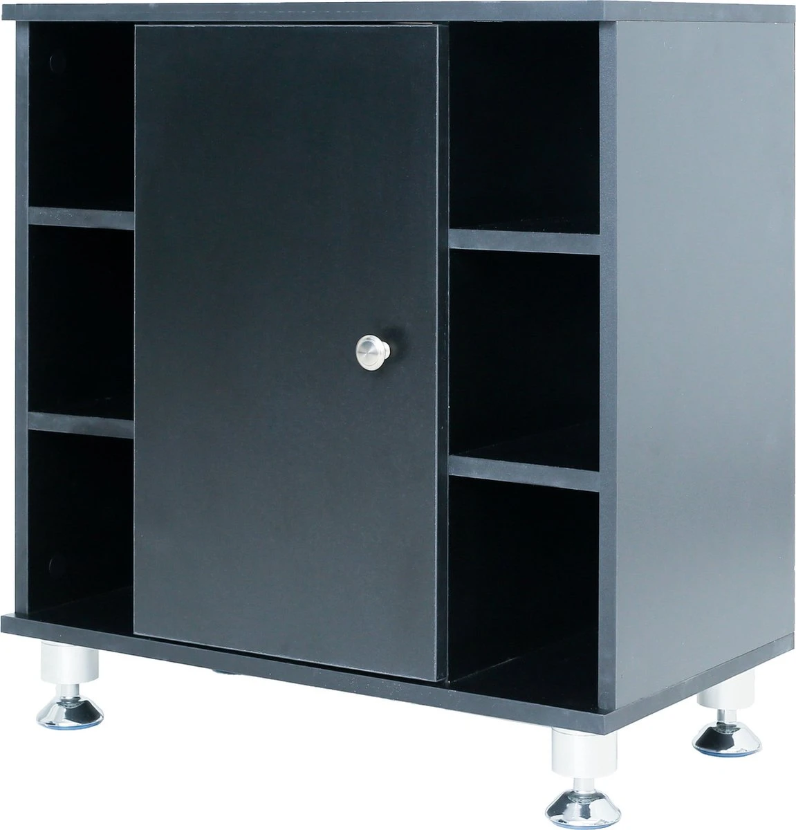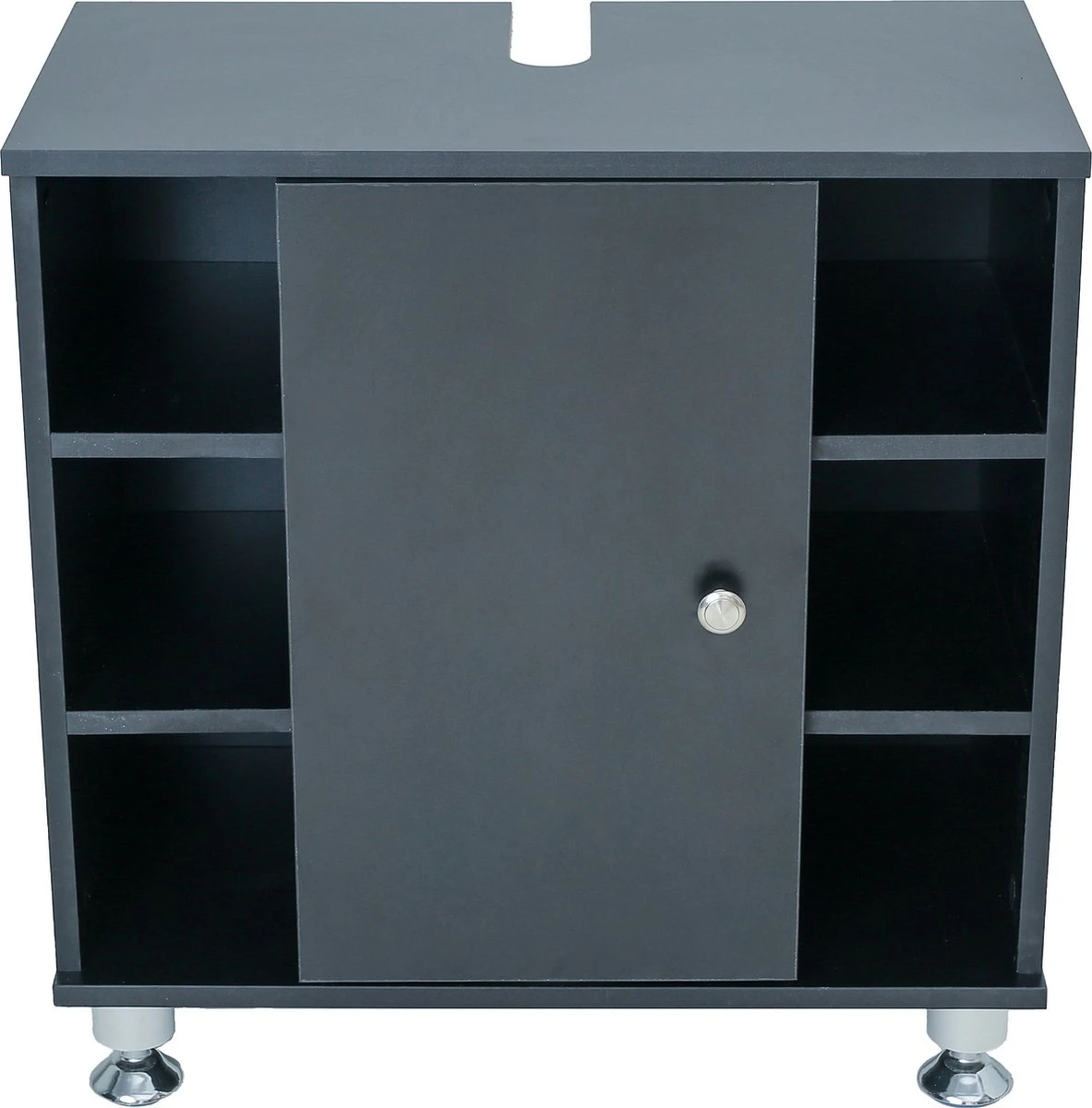 Deze onderkast voor onder de wastafel is ideaal voor elke badkamer. Het wastafel onderbouw meubel is ruimtebesparend en biedt voldoende opbergmogelijkheden zodat uw badkamer ordelijk blijft. De vier pootjes bieden de juiste stabiliteit. Het meubel heeft 6 kleine open opbergvakken, 3 rechts en 3 links en in het midden 1 groot opbergvak met 1 legplank die afgesloten kan worden door middel van een openslaande deur. Kleur: zwart. Afmetingen: hoog 62 cm breed 60 cm diep 32 cm. Levering is inclusief handleiding en benodigde montagematerialen.