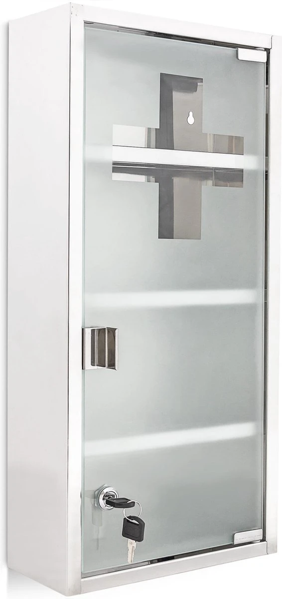 In dit grote medicijnkastje kun je alles opbergen wat je voor een medische verzorging en een huisapotheek nodig hebt. De 4 ruime vakken bieden veel opbergruimte voor medicijnen, verbandmateriaal en andere dingen. Dankzij de afsluitbare, magnetische deur van glas kun je de inhoud buiten het bereik van kinderen bewaren.