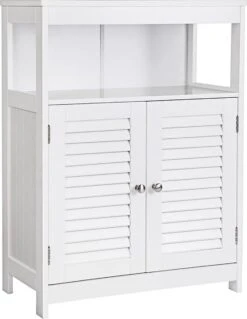 Songmics Badkamerkast Van Hout, Badkamerorganizer, Badkamerrek, Vrijstaand Met 2 Lamellendeuren, Wit, BBC40WT