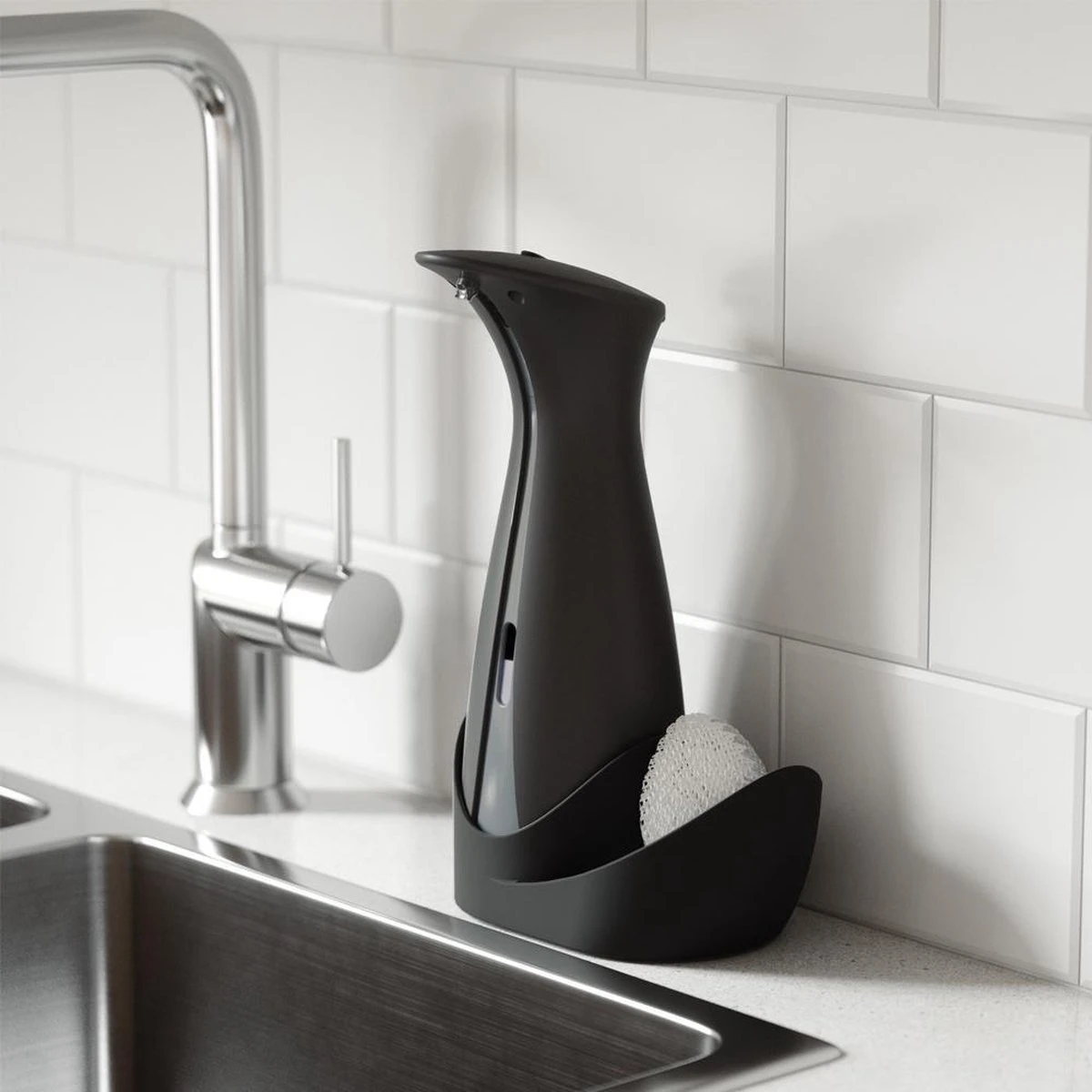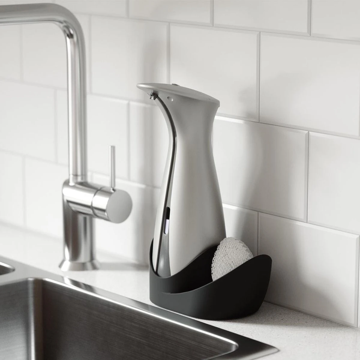 Handen wassen kan heel hygiënisch met deze zeepdispenser met sensor van UMBRA. Met handig sponsbakje voor een opgeruimd aanrecht.