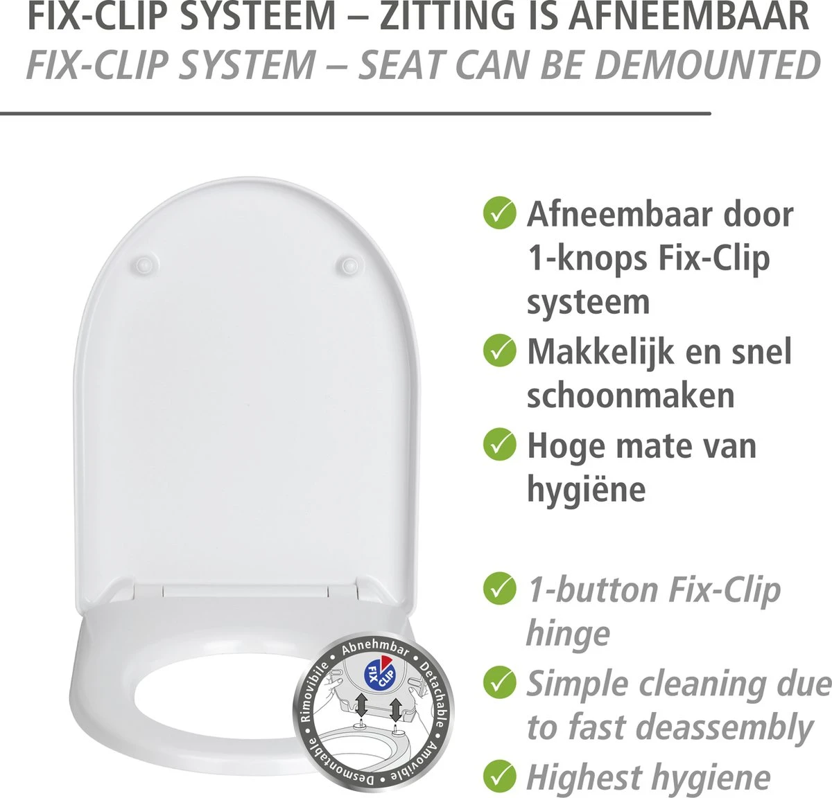 De 1-knops Fix-Clip sluiting van roestvrij staal maakt een goede reiniging mogelijk, omdat de complete WC bril snel en eenvoudig kan worden verwijderd én weer vastgeklikt.